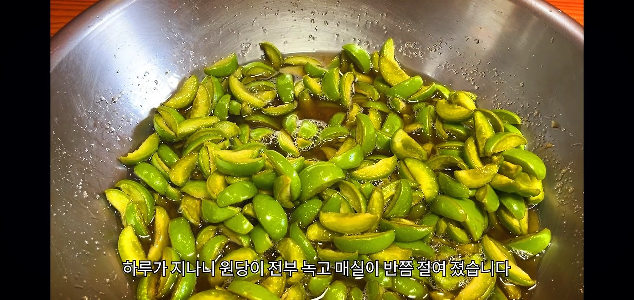 하루 동안 숙성시키면 원당이 완전히 녹아내리고 매실에서 자연스럽게 매실액이 나와요.