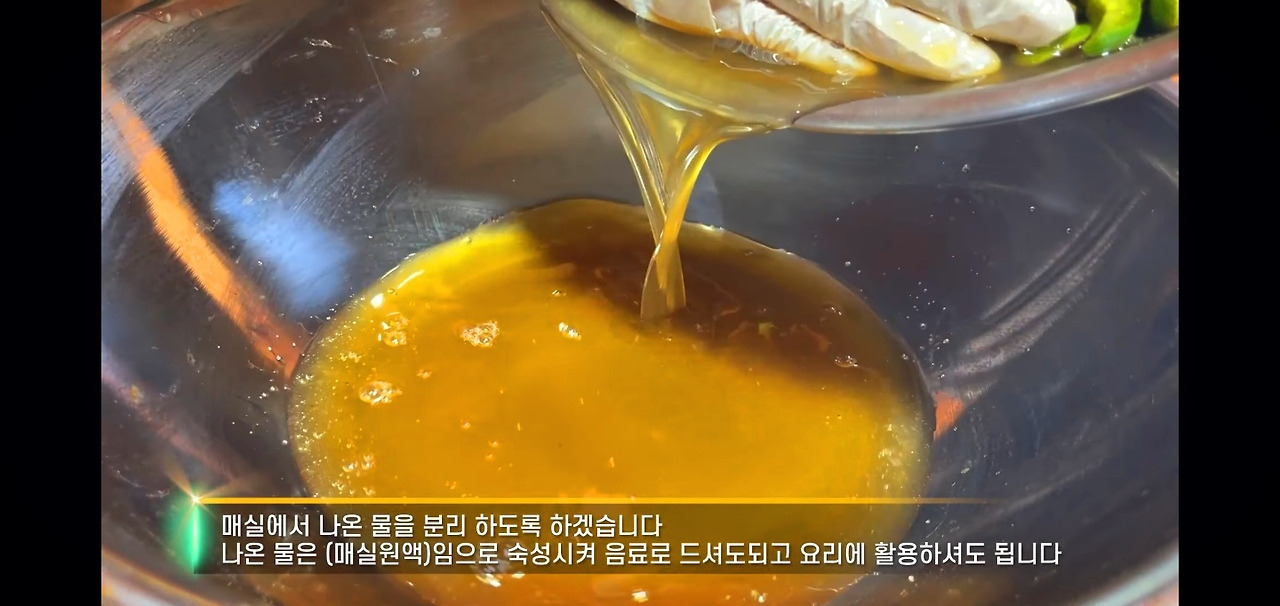 매실을 절인 후 나온 액체는 모두 따라내주세요. 이 매실액은 물에 타서 식사 후 마셔도 좋고, 요리할 때 활용해도 아주 유용하답니다!
