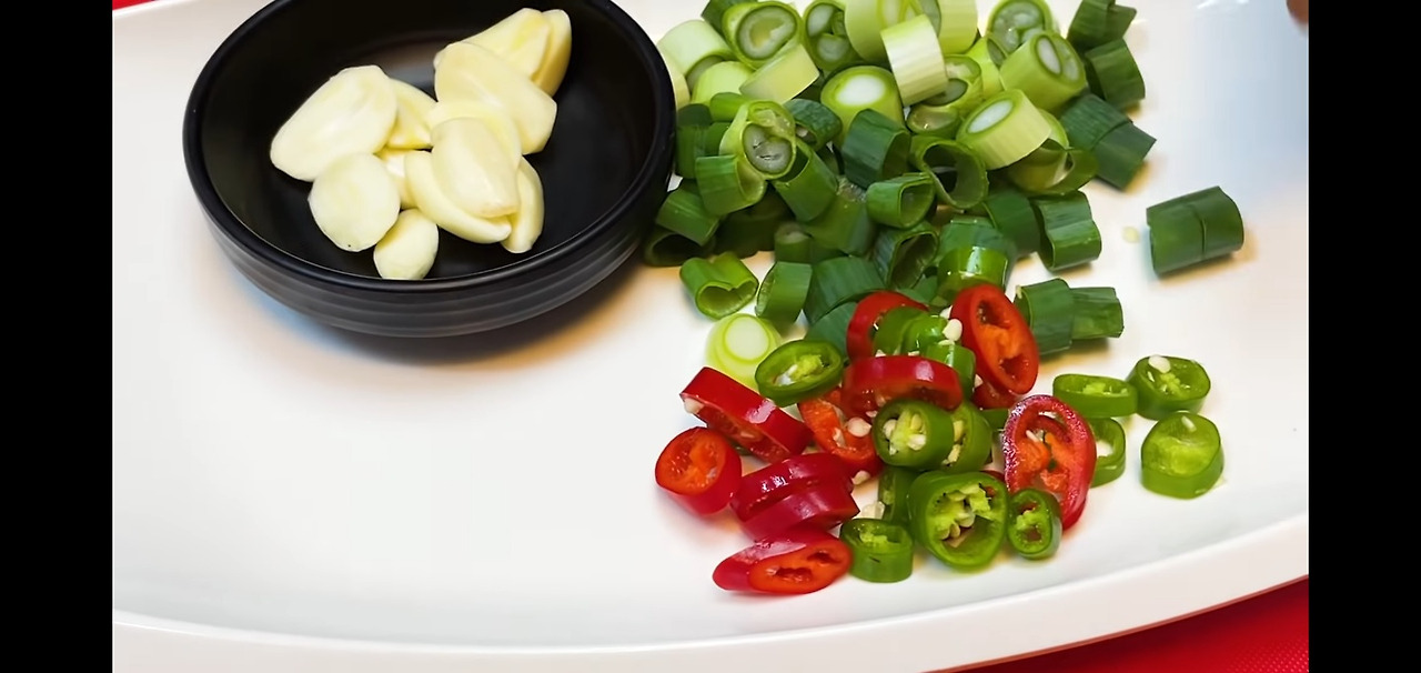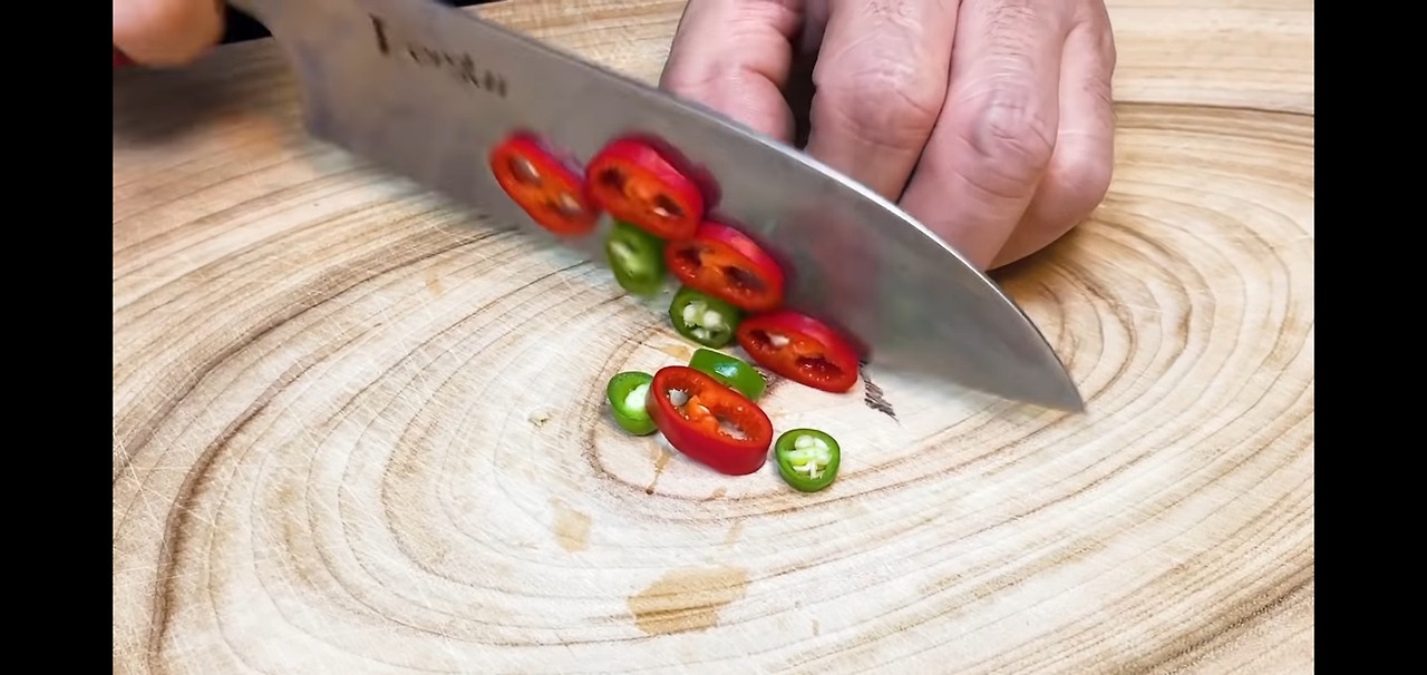 청양고추 1~2개와 홍고추 반 개를 썰어 홍합탕에 매콤한 맛을 더해 주세요.