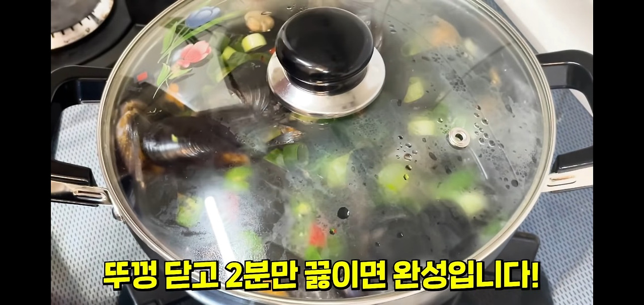 그다음, 썰어둔 대파와 고추를 넣고 뚜껑을 덮은 채로 2분 정도 더 끓이면 오늘의 홍합탕이 완성돼요!