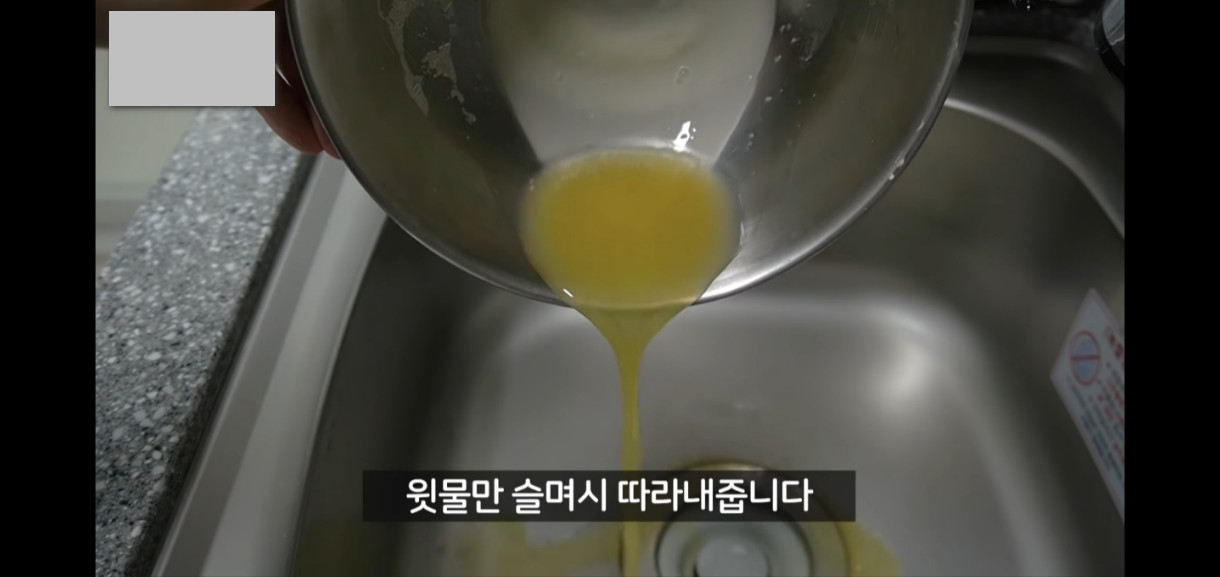감자전을 만들기 위해 감자를 반죽할 차례예요. 채에 걸러서 나온 전분과 물기 중에서 물기만 살짝 버려주세요.