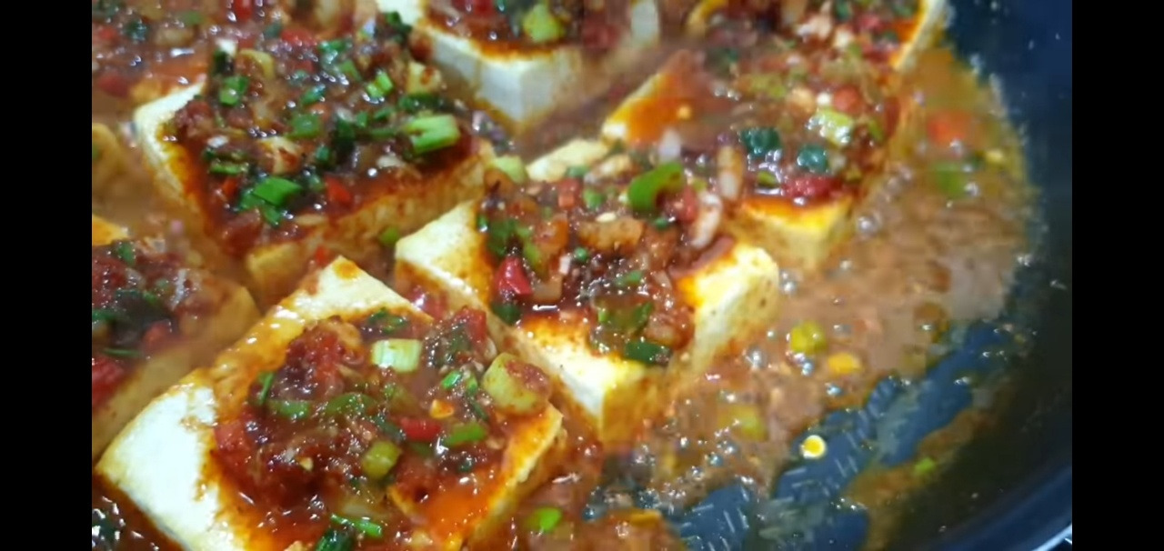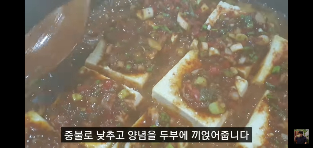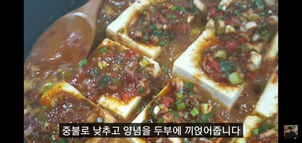 뚜껑을 열고 중불로 불을 낮춘 뒤, 밑에 있는 양념을 두부 위에 끼얹으면서 구워주세요.