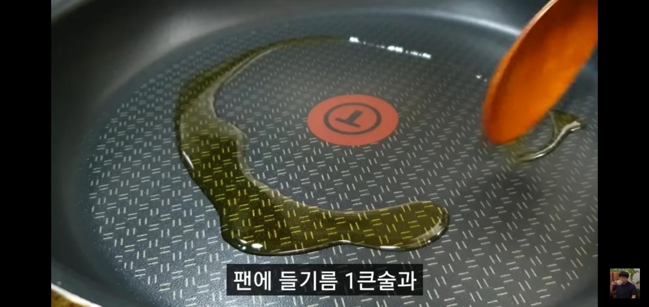 이제 본격적으로 두부조림을 만들어볼게요. 팬에 들기름 1스푼과 식용유 1스푼을 넣고, 두부를 넓게 펴서 구워주세요. 이때 불은 중불로 설정하세요!