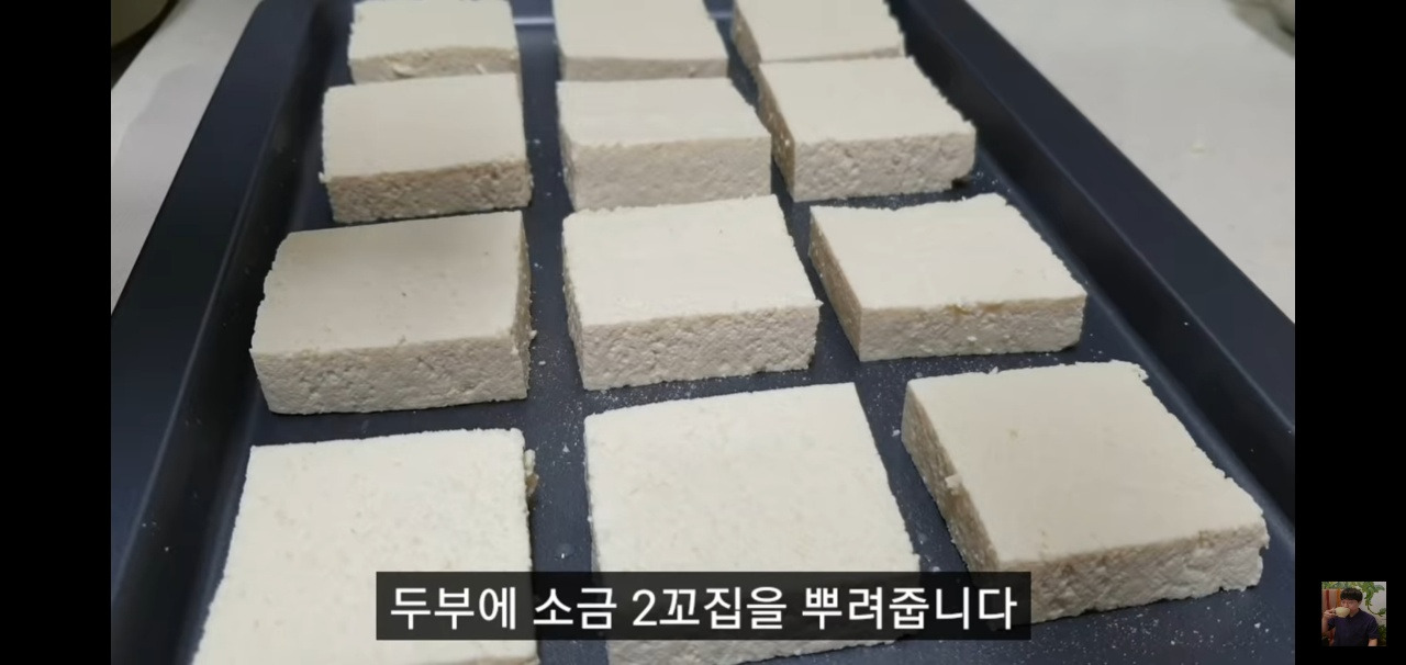 그다음, 소금 두 꼬집을 고루 뿌려서 간을 맞추면 두부 손질이 끝나요!