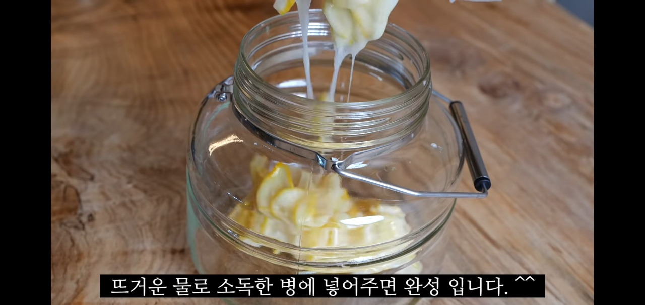 마지막으로 뜨거운 물로 소독한 병에 넣어주면 유자청이 완성돼요!