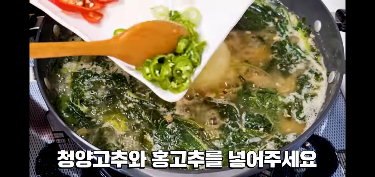 미리 썰어둔 청양고추와 홍고추도 함께 넣어주세요.
