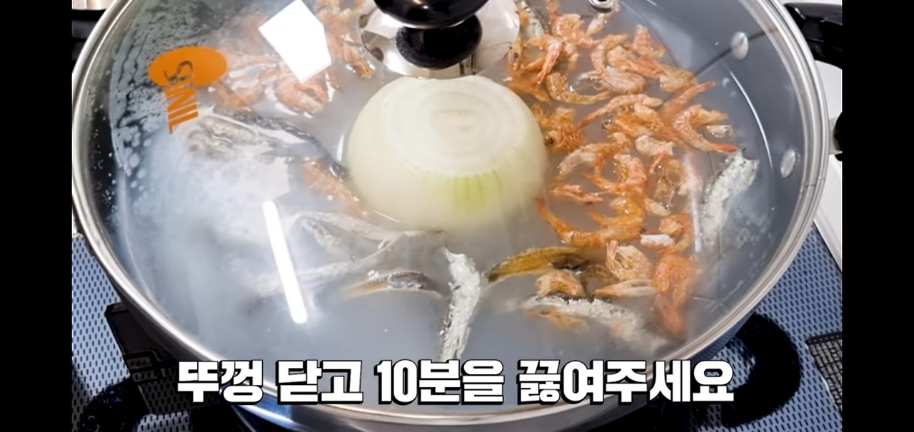 멸치 한 줌과 건새우 한 줌을 함께 넣고 끓여주세요.