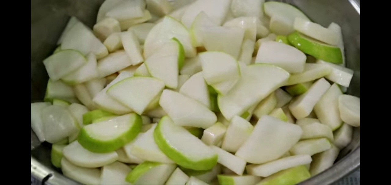 이제 본격적으로 석박이 김치를 만들어볼게요. 절여진 무를 큰 통에 담아주세요.