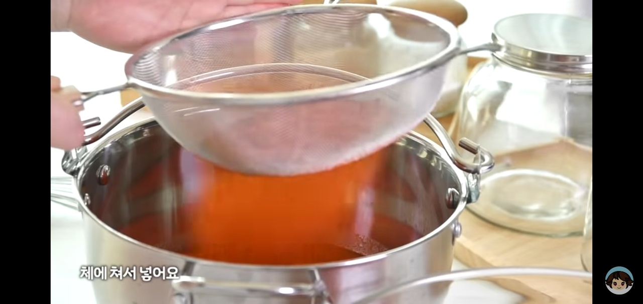 가루를 채에 넣고 손바닥으로 옆면을 가볍게 두드려서 가루가 잘 풀리도록 해주세요.