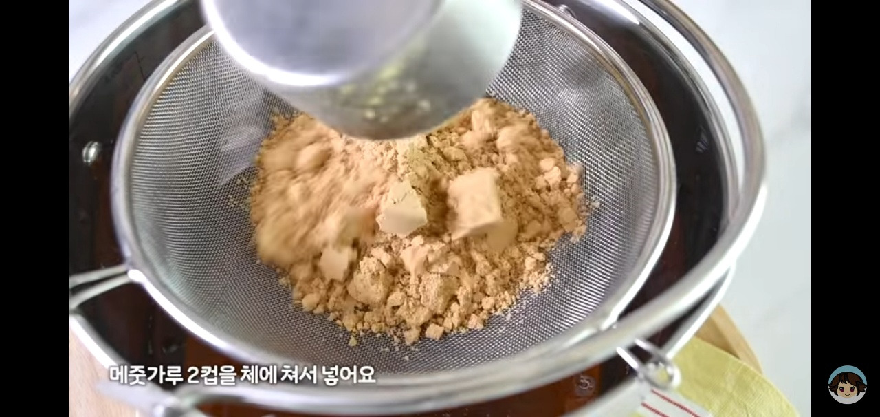 고추장을 만들 때 고소한 맛을 더해줄 메줏가루 2컵을 체에 걸러서 부드럽게 넣어주세요.