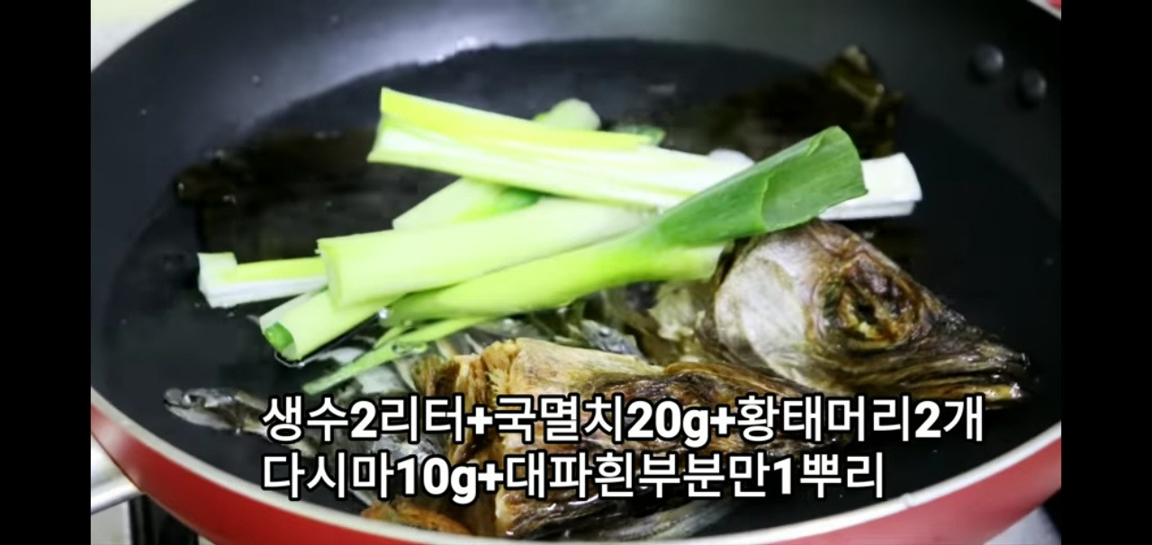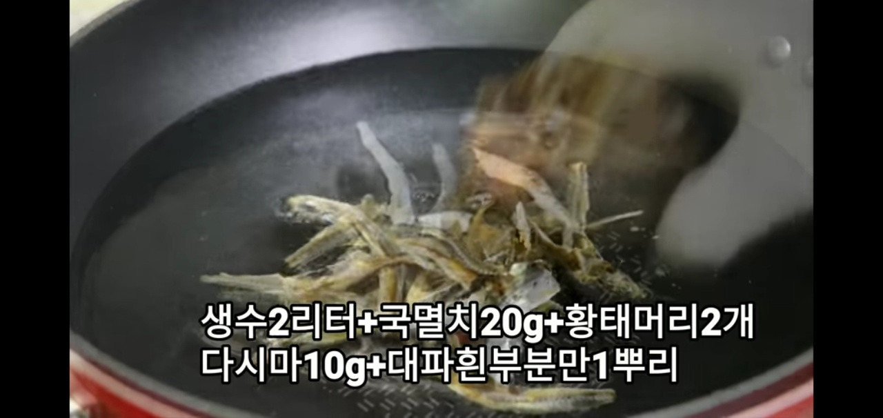 물 2L에 멸치 20g, 황태머리 2개, 다시마 10g을 넣어주세요.