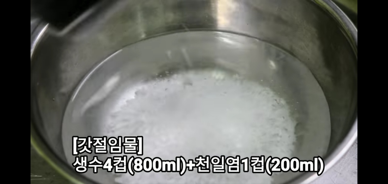 작은 양동이에 물 4컵과 천일염 한 컵을 넣고 잘 풀어주세요.
