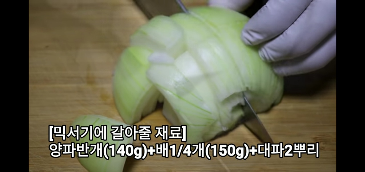 준비한 양파, 배, 대파를 믹서기에 넣어주세요.