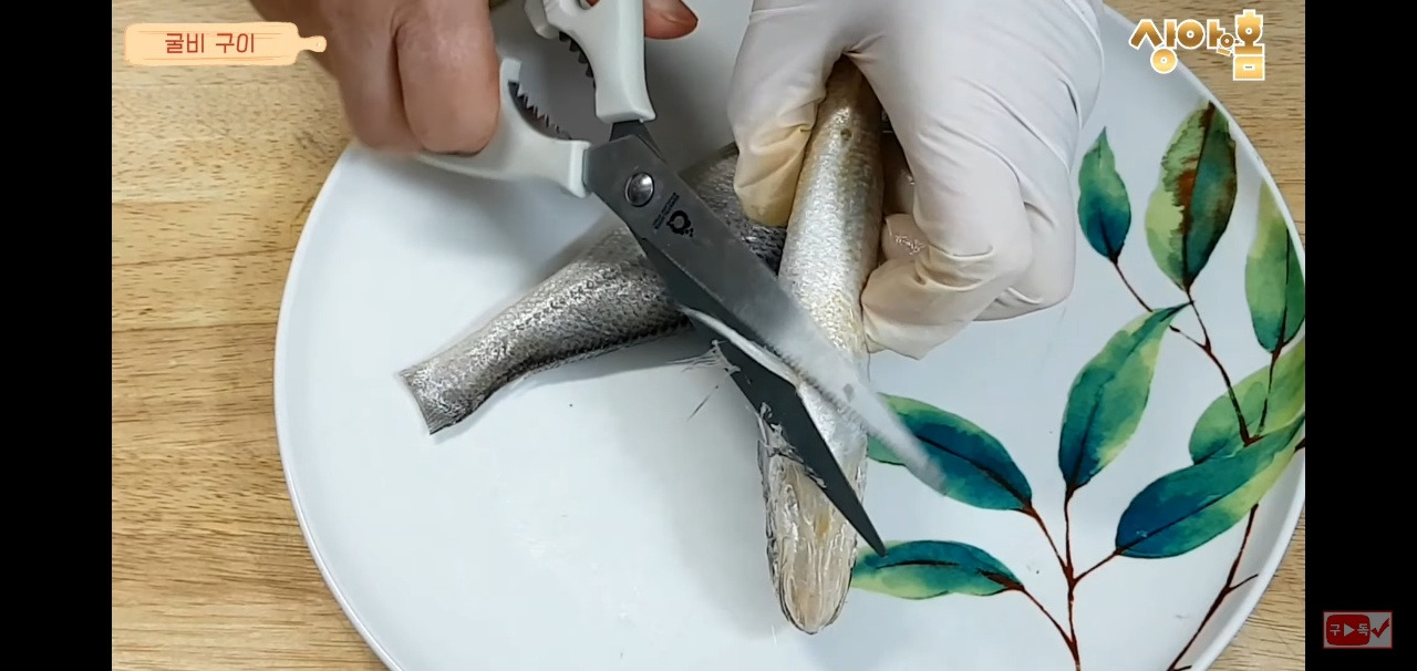 그다음, 가위를 이용해 등, 배, 옆구리에 있는 지느러미를 잘라내면 훨씬 깔끔한 굴비 구이를 즐길 수 있어요!