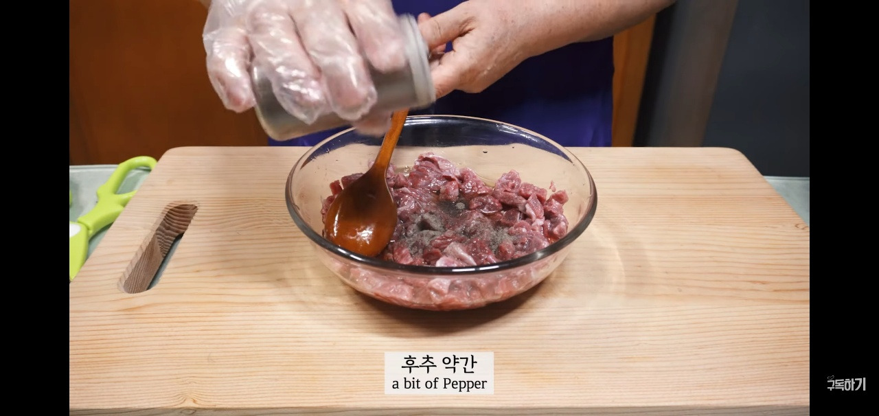 후추도 살짝 넣어서 고기에 맛을 더해주고, 이 상태로 10분 정도 두어 맛이 배게 기다려주세요.