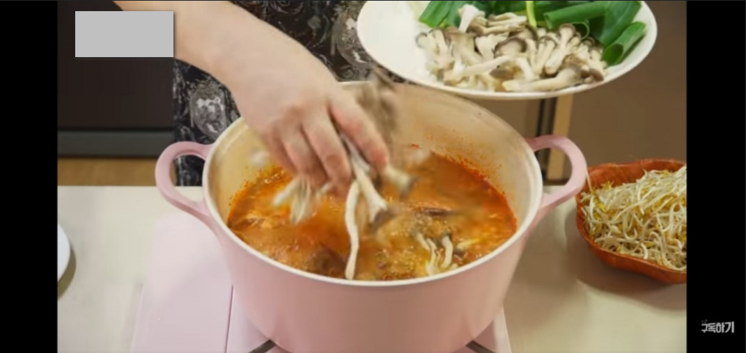 고사리는 익을수록 부드러워지기 때문에 닭고기와 함께 넣고 처음부터 끓여주세요. 그런 다음 한참 끓인 후에 느타리버섯도 넣어주세요.