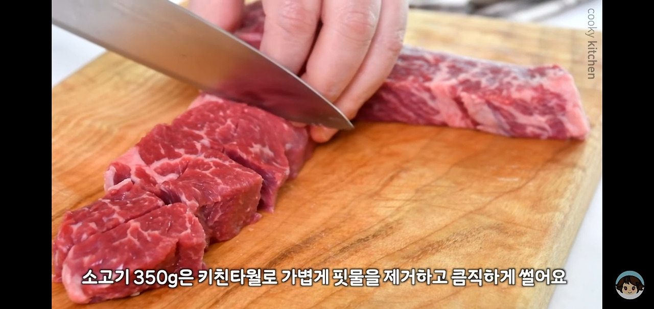 이번에 사용할 소고기 350g은 키친타월로 살짝 눌러서 핏물을 제거해 주세요.