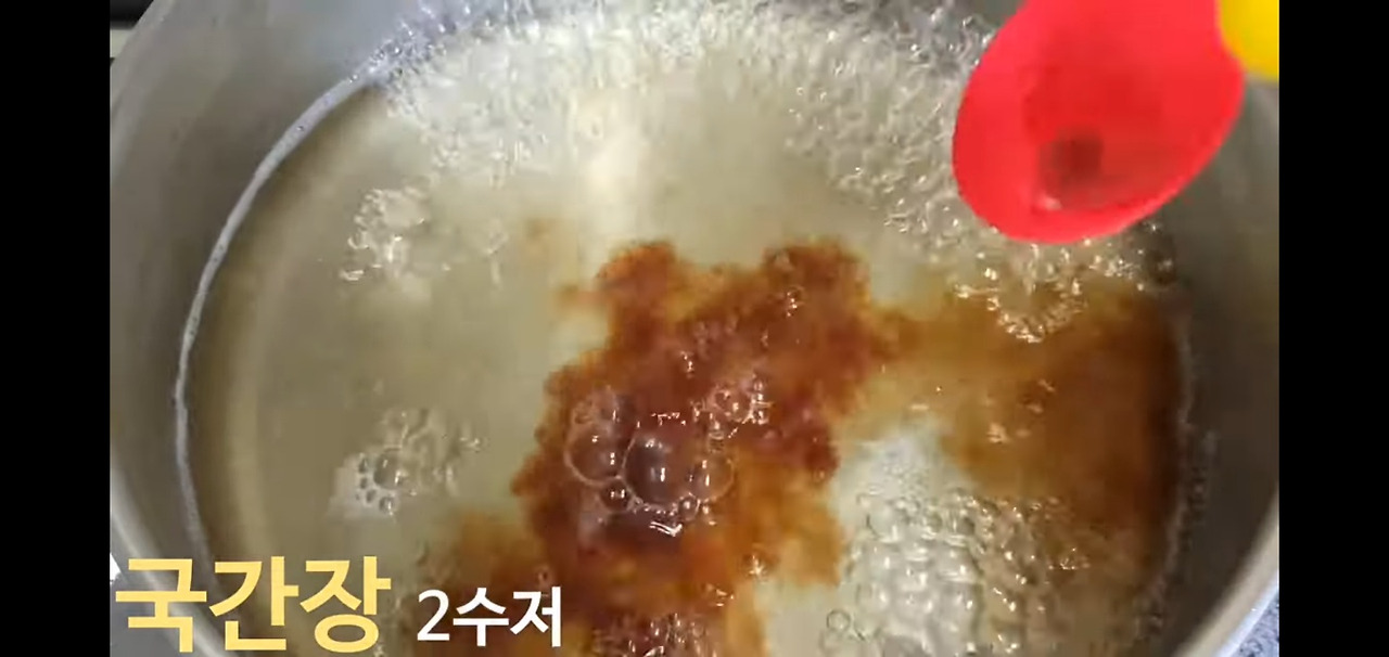 만둣국 육수에 간을 맞춰보겠습니다. 국간장 2스푼을 넣어주세요.