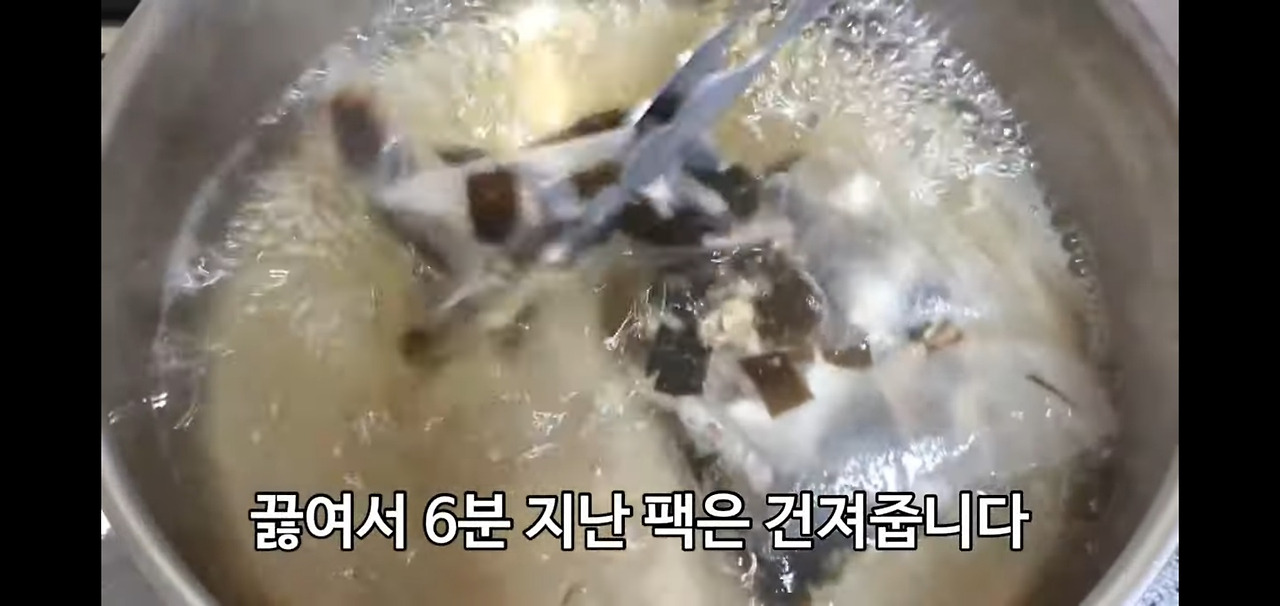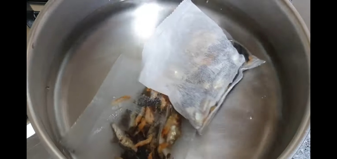 물이 끓고 6분 정도 지나면, 육수팩을 건져내세요. 그렇게 하면 만둣국에 사용할 깊고 풍미 있는 육수가 완성됩니다.
