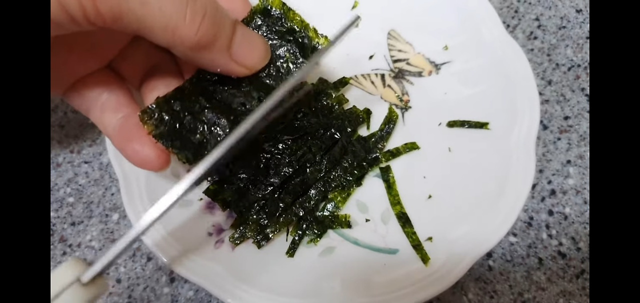 그 다음 남은 대파는 작은 크기로 송송 썰어 고명으로 준비하고, 김도 잘게 썰어 준비해 주세요.