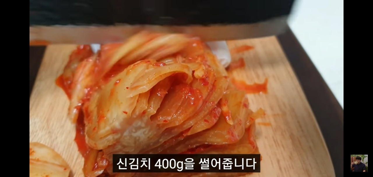 그 다음, 신김치 400g을 먹기 좋은 크기로 썰어주세요.