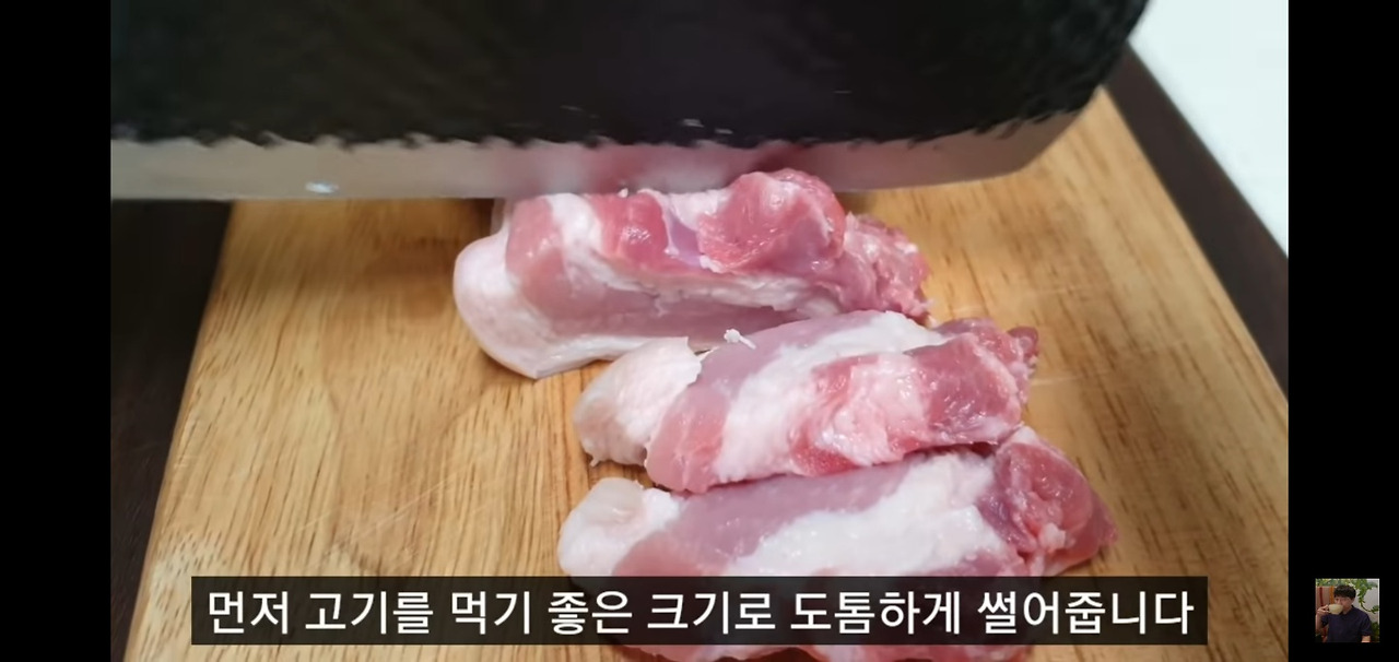먼저, 신선한 돼지고기(삼겹살)를 먹기 좋은 크기로 도톰하게 썰어주세요.