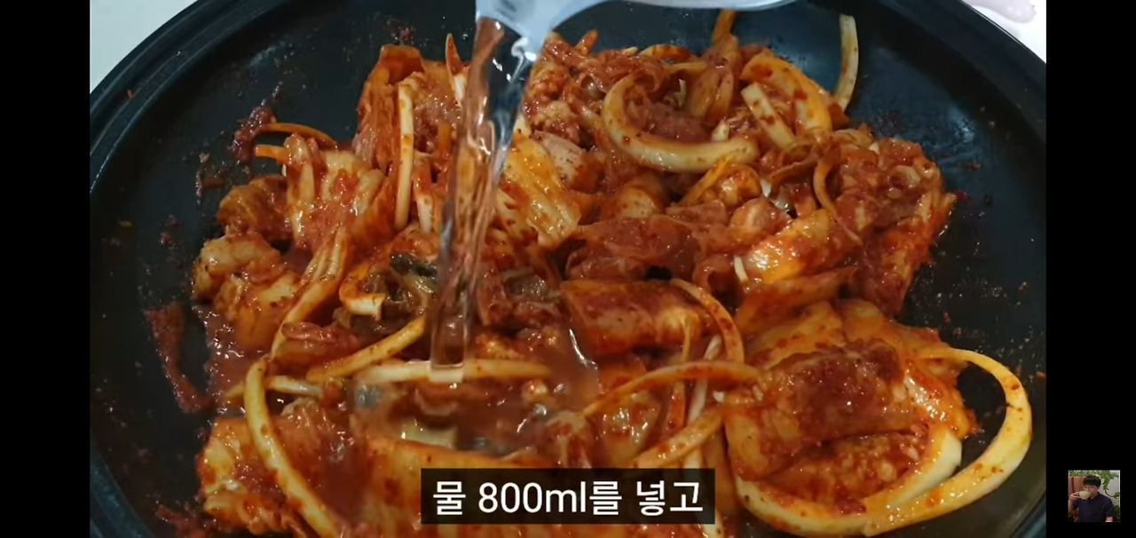 적당히 익은 재료들에 물 800ml를 넣어주세요.