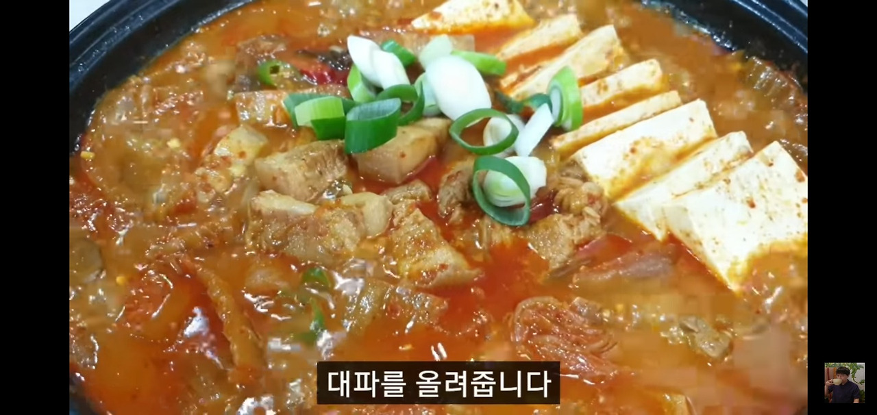 한소끔 더 끓인 후, 썰어둔 대파를 올려 마무리하면 오늘의 돼지고기 김치찌개 황금레시피가 완성됩니다!
