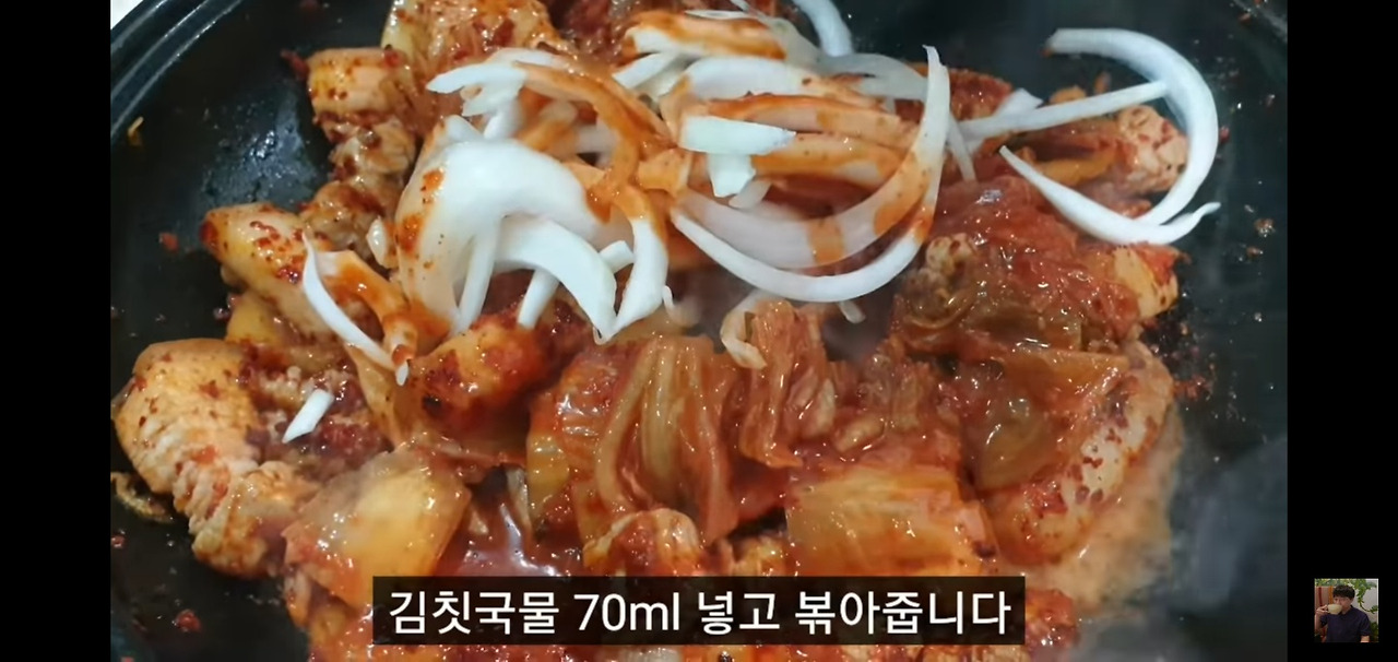 그 다음, 양파와 김칫국물 70ml를 함께 넣고, 김치가 어느 정도 익을 때까지 잘 볶아주세요.