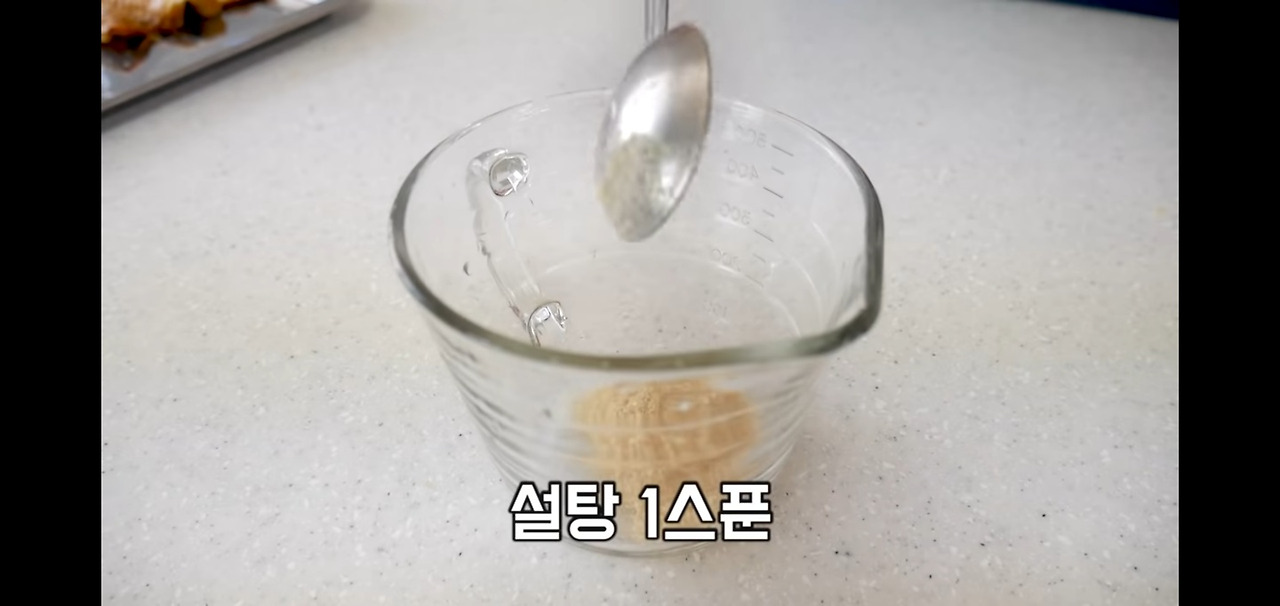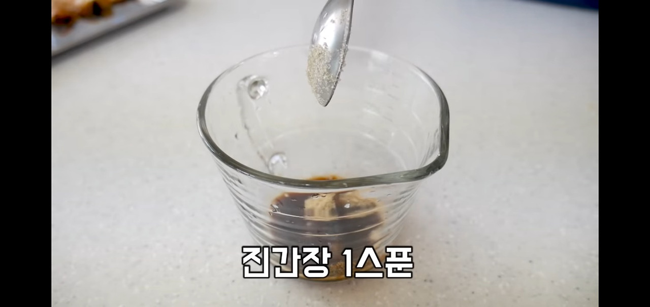 먼저, 설탕과 진간장을 각각 1스푼씩 넣어 주세요.