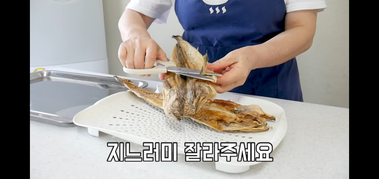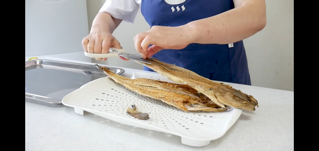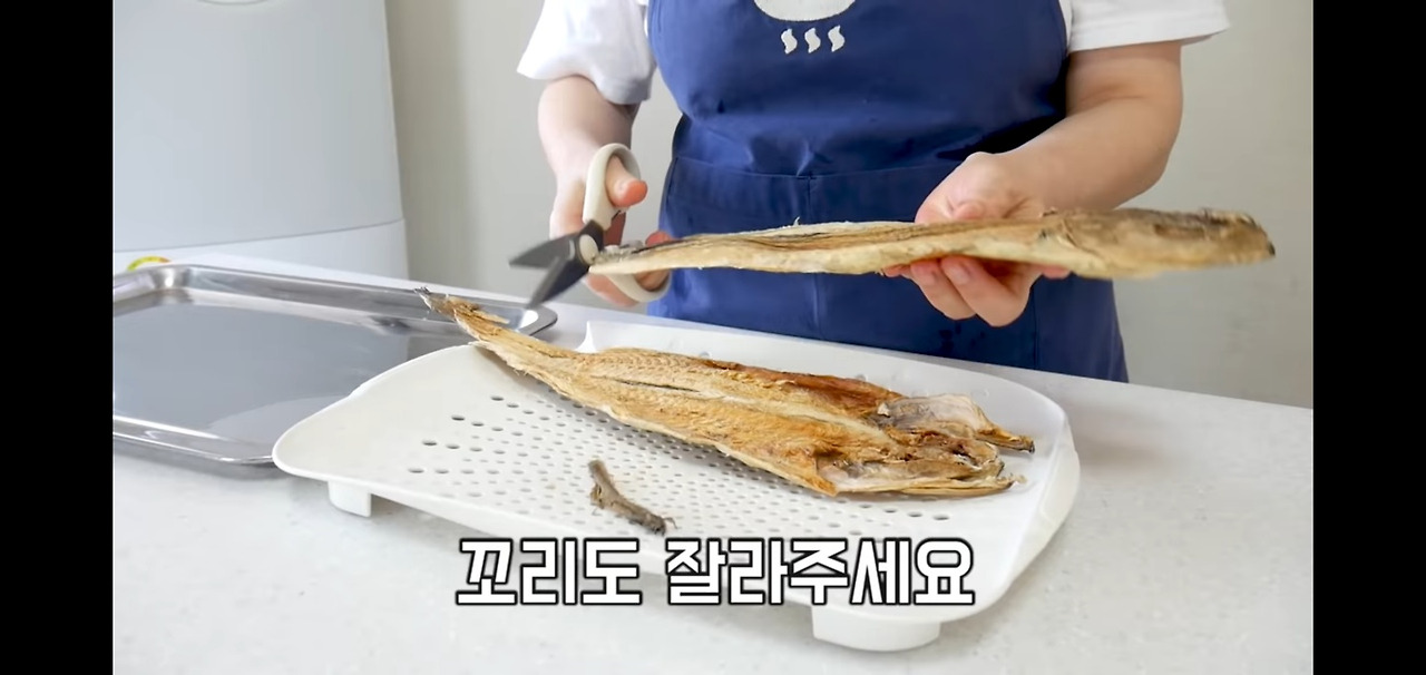 먼저, 드실 때 불편함을 줄 수 있는 황태의 지느러미와 꼬리 부분을 가위로 잘라 깔끔하게 정리해 주세요.