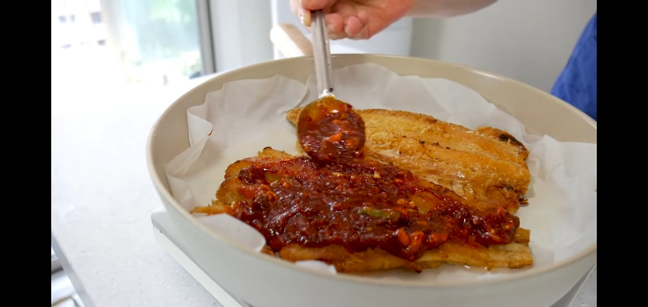윗면에 양념장을 골고루 바른 후, 황태를 뒤집어서 아랫면에도 양념을 고루 발라 주세요.