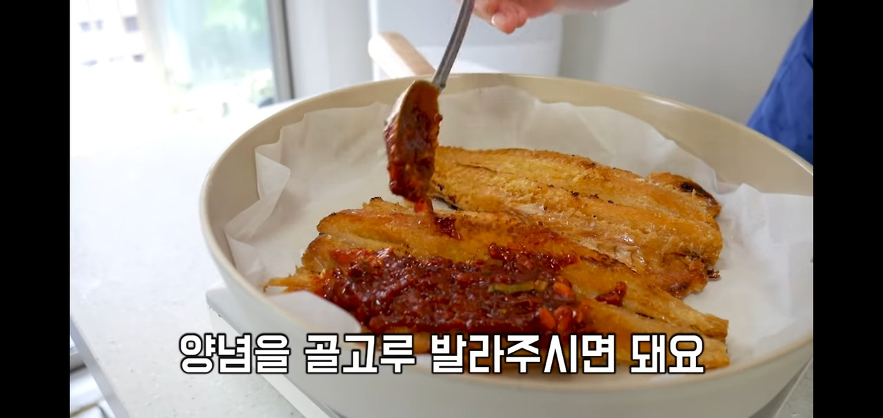그 위에 미리 준비한 황태구이 양념장을 골고루 발라 주세요.