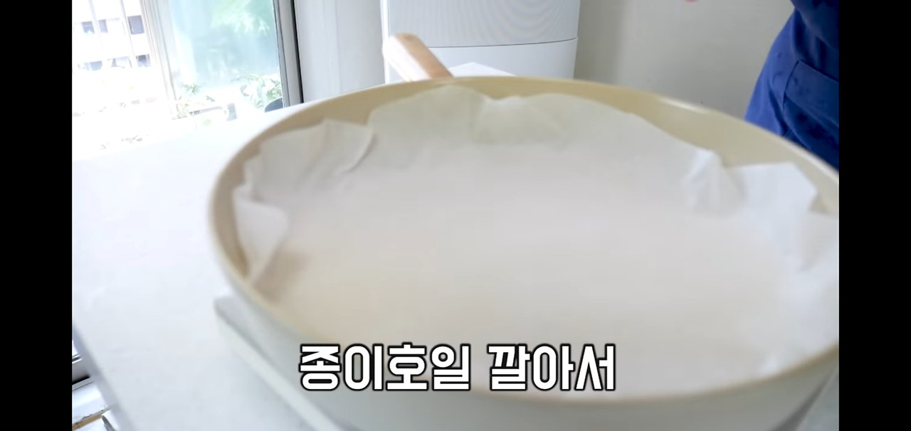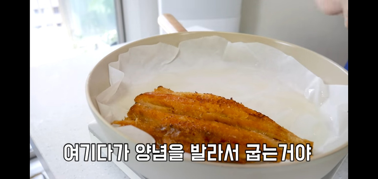 다 구워진 황태는 따로 옮겨 놓고, 팬에 종이호일을 깔아 주세요.