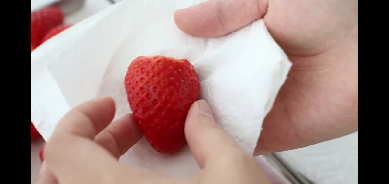 깨끗하게 씻은 딸기는 키친타올로 물기를 잘 닦아주세요.