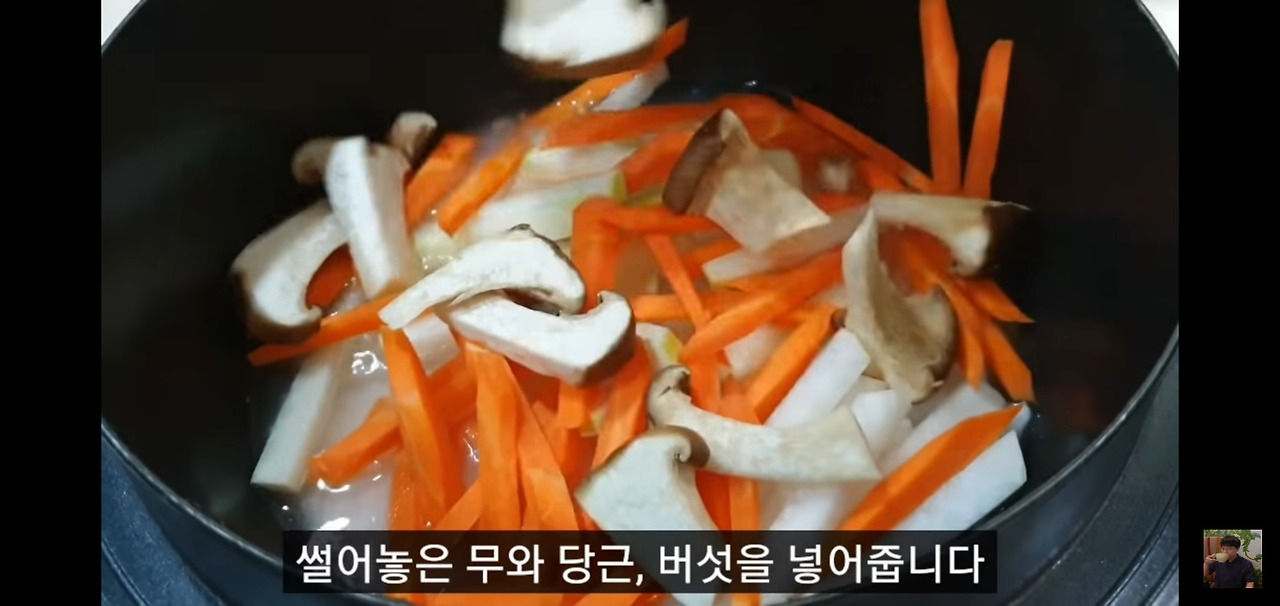 그다음에 썰어둔 무, 당근, 버섯도 함께 넣어주세요.