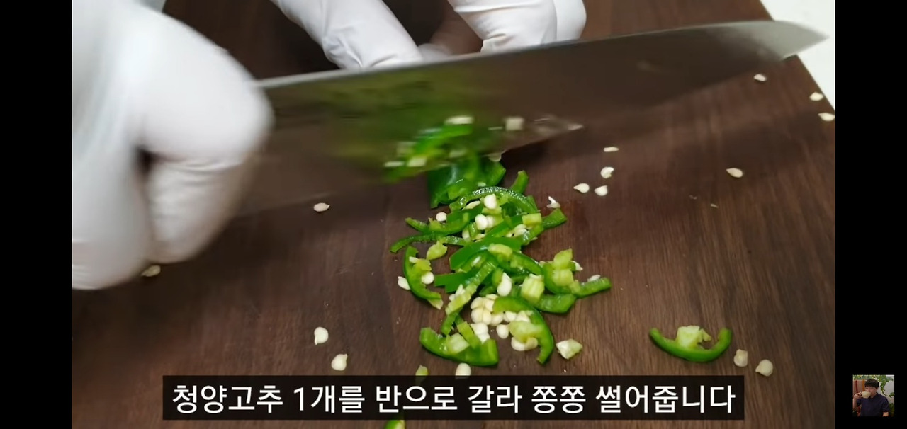 매콤한 맛을 더해줄 청양고추 한 개도 반으로 갈라서 송송 썰어주세요.