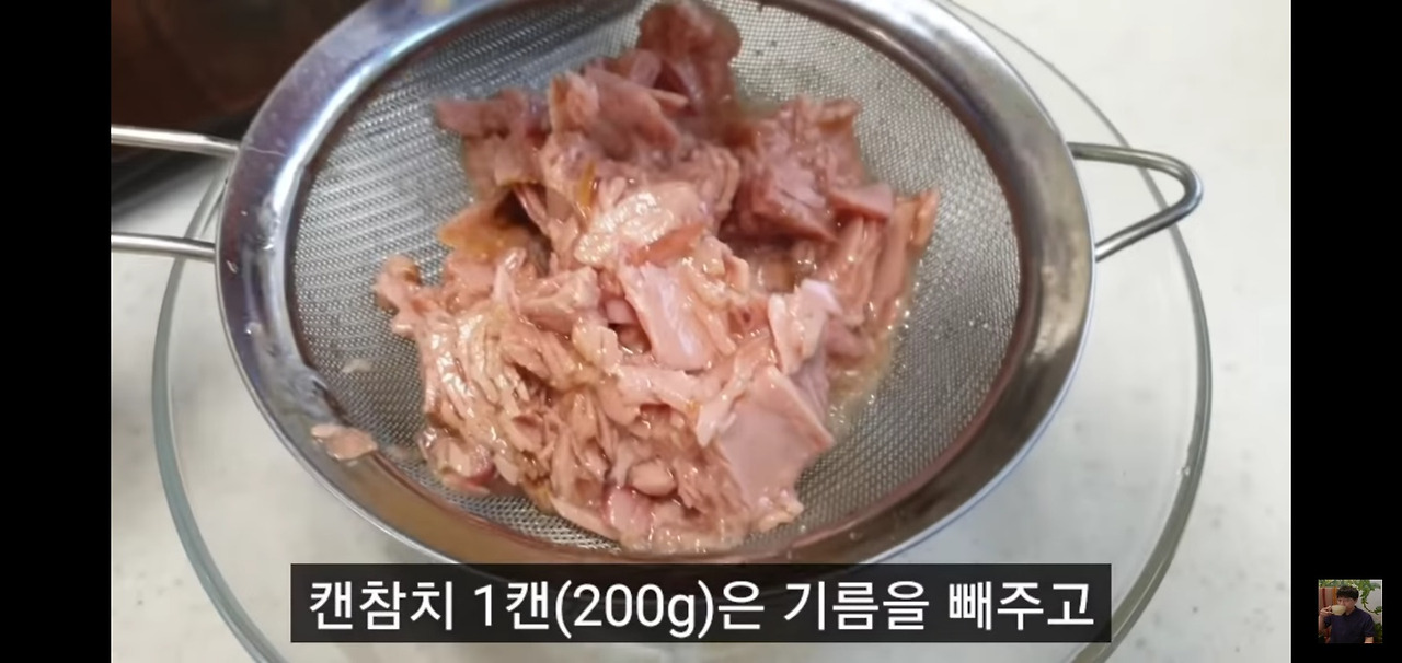 참치캔(200g)은 기름을 제거한 후 두부와 함께 담고, 다진 마늘 반 스푼을 넣어주세요.