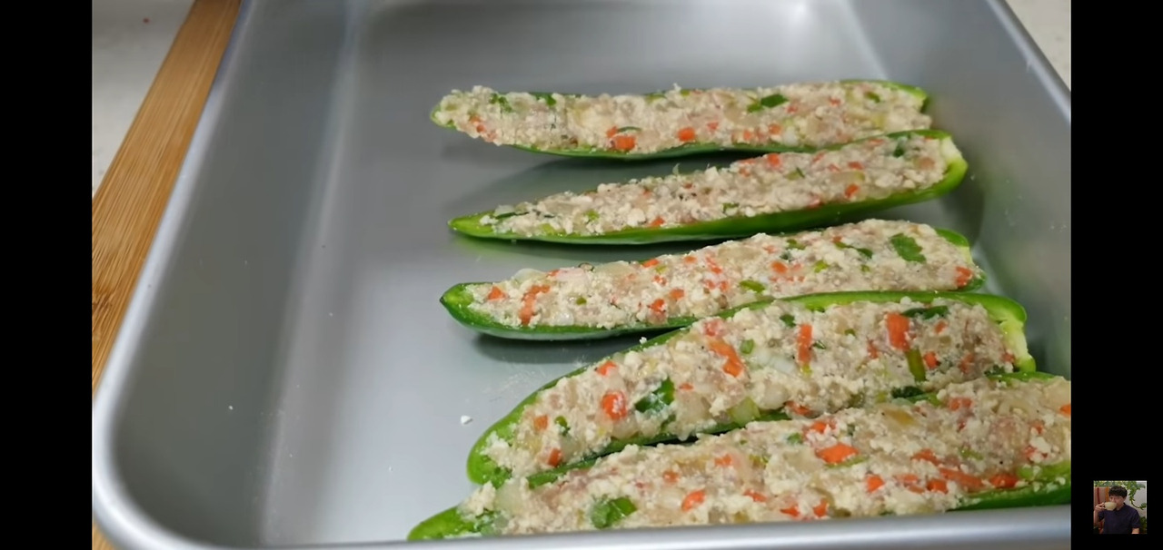 그다음, 준비한 고추전 속을 고추에 넣어 주세요.