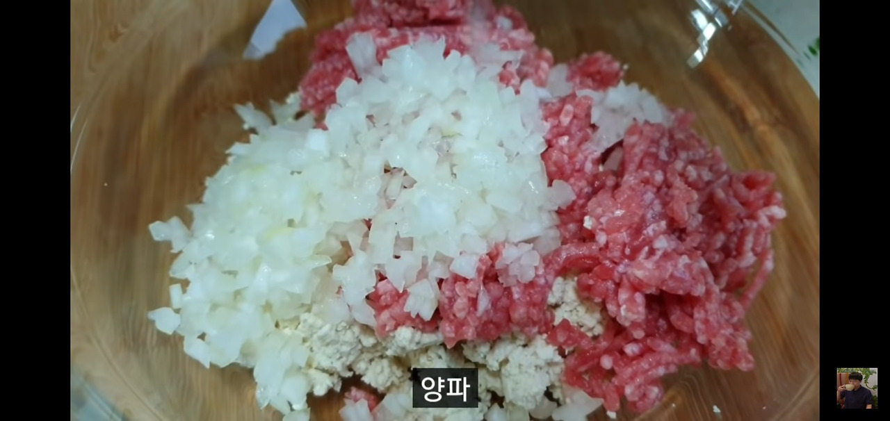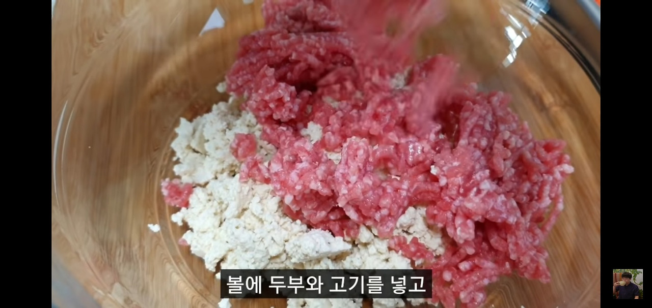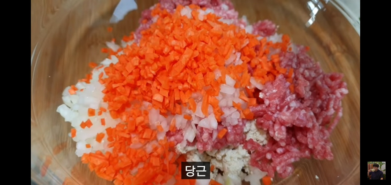 그릇에 두부, 고기, 양파, 그리고 당근을 넣어 주세요.