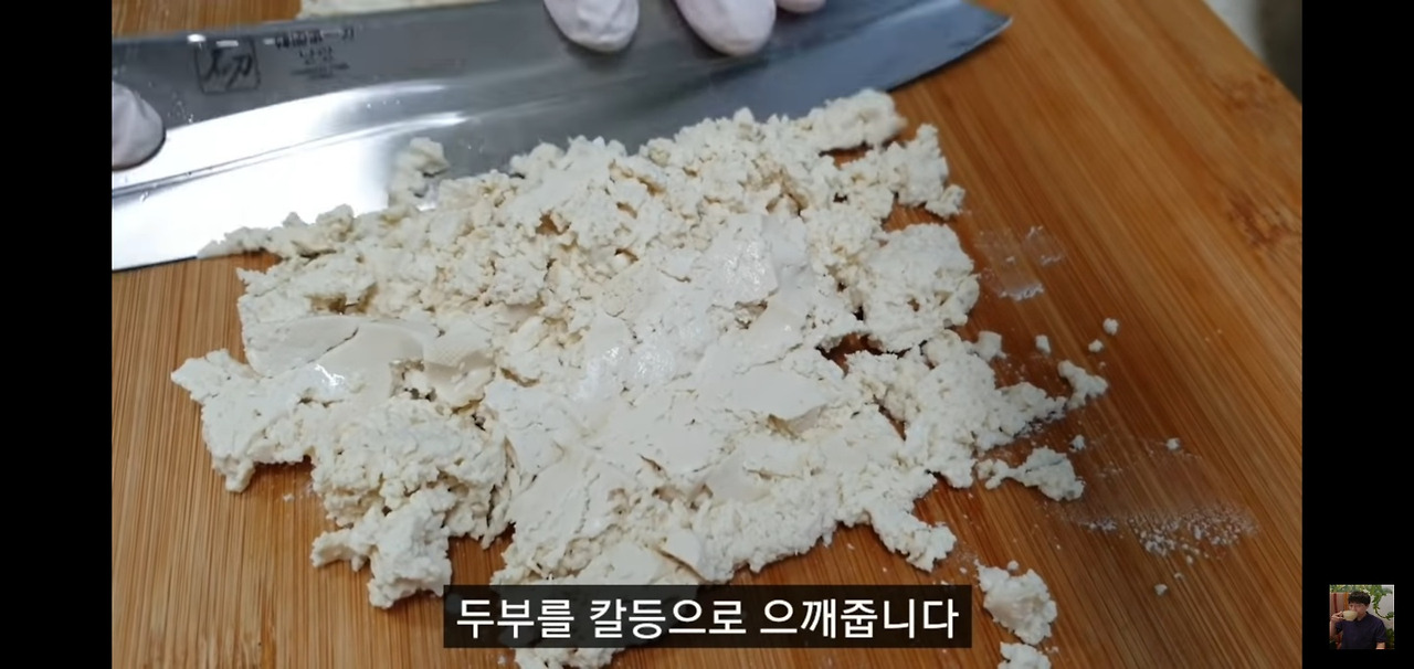 그 다음, 두부를 손으로 눌러서 물기를 제거한 후, 칼등을 이용해 잘게 으깨 주세요.