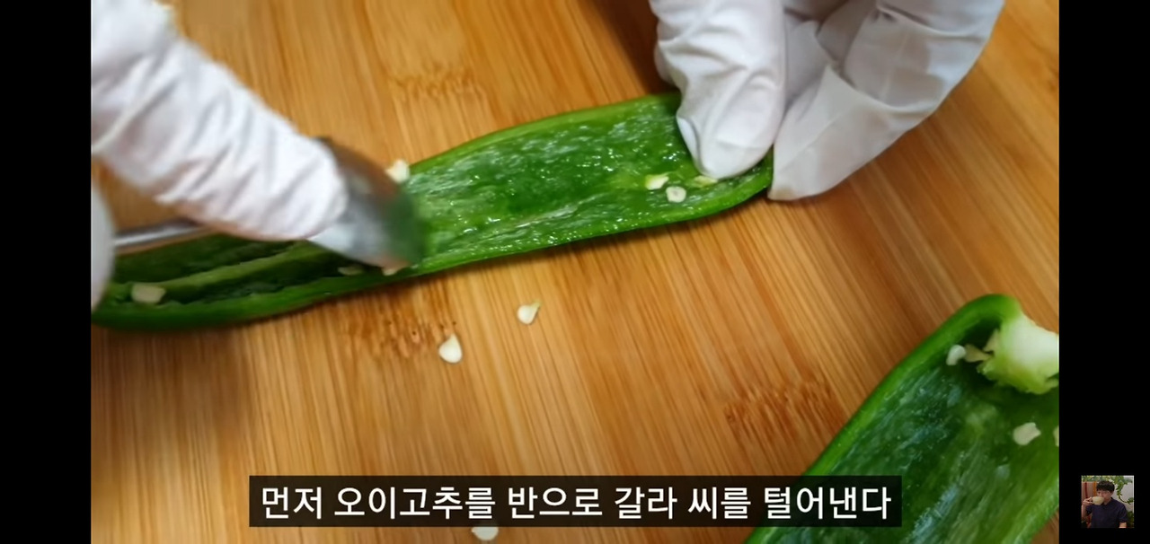 오이고추를 가른 후, 숟가락을 이용해 안쪽에 있는 씨를 제거해 주세요.