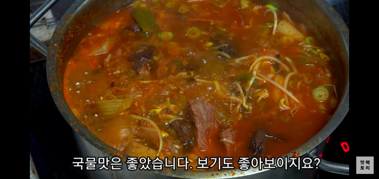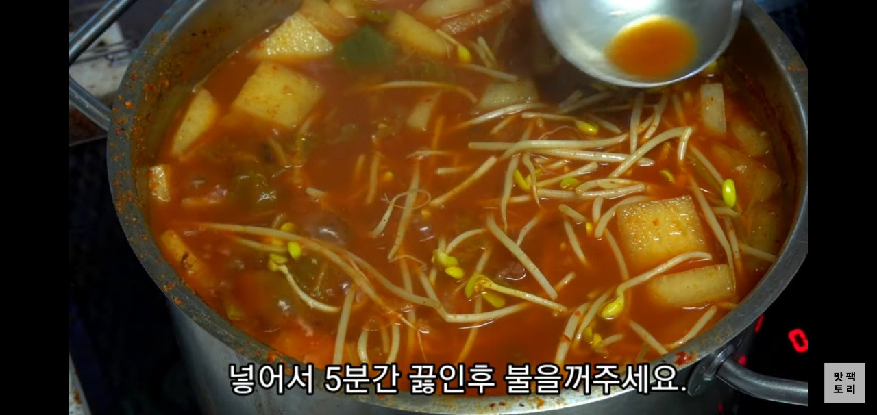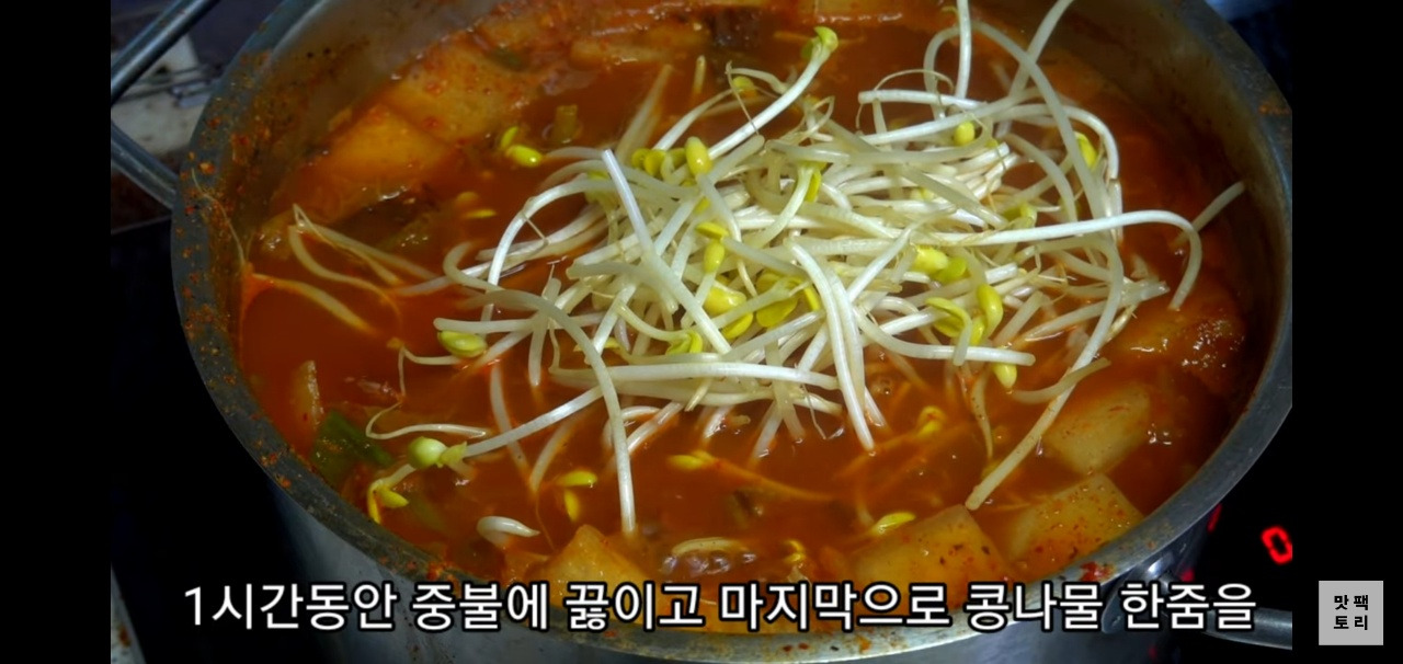 1시간 동안 중불에서 푹 끓인 후, 콩나물 1줌을 넣고 5분간 더 끓여주세요.