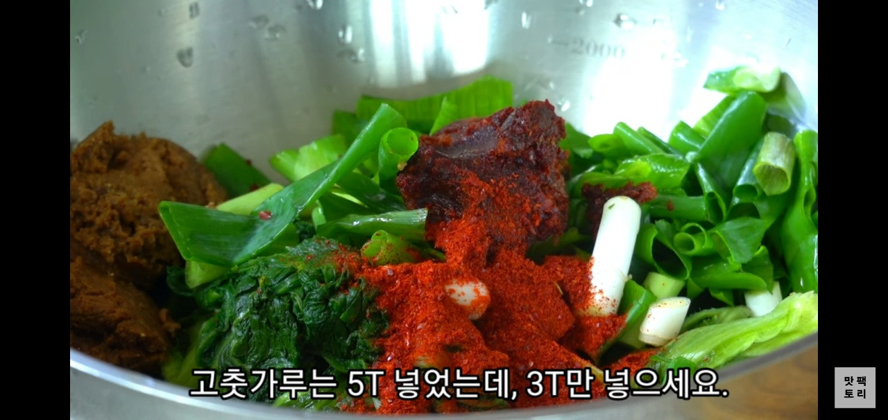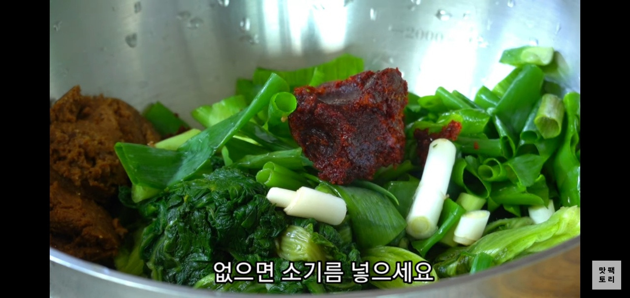 썰어둔 얼갈이와 대파를 넣은 뒤, 집된장 3스푼을 더해주세요. 집된장이 없다면 시중에서 판매하는 된장을 사용해도 괜찮아요.