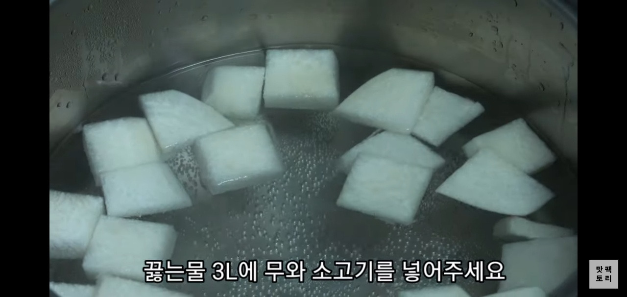 물 3L에 썰어둔 무와 소고기를 넣고, 끓어오르면서 생기는 거품은 걷어내 주세요.