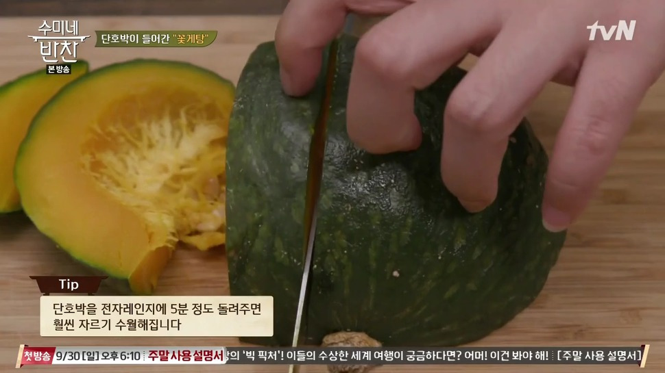 참고로, 단호박은 전자레인지에 약 5분 정도 돌리거나 뜨거운 물에 3분 정도 데치면 훨씬 부드러워져서 자르기 쉬워요. 그리고 껍질은 전부 벗기기보다는 일부 남겨두면 익혔을 때 더욱 먹음직스러워 보인답니다.