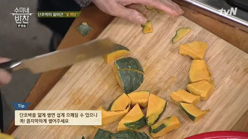6. 국물이 끓기 시작하면, 준비해 둔 단호박과 무 1/4개를 적당한 크기로 썰어 넣어 주세요.
