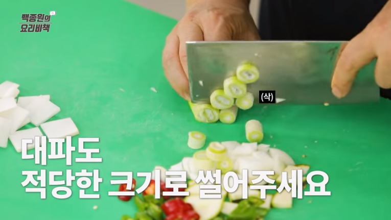 3. 청양고추와 홍고추는 어슷하게 썰고, 대파는 1cm 간격으로 송송 썰어줍니다.