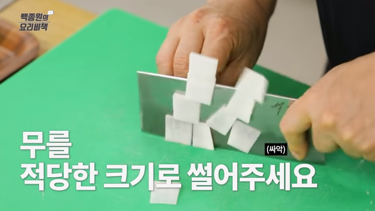 2. 무는 0.5cm 두께로 네모나게 작게 썰어줍니다.