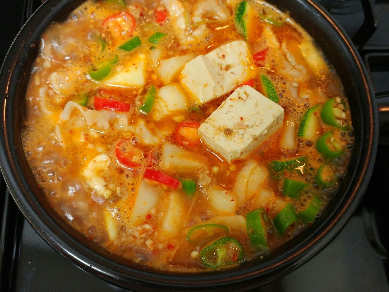 7. 된장찌개가 어느 정도 식은 뒤에는 준비한 채소, 두부, 다진 마늘, 그리고 굵은 고춧가루를 넣고 5분 정도 더 끓여줍니다. MSG는 취향에 따라 추가하셔도 좋습니다.